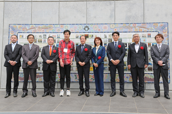 最後にアートタイル壁画の前で集合写真の撮影を行い、大盛況のなか『東日本大震災復興祈念アートタイル壁画展~KIZUNA~』の除幕式を無事終えることができました。